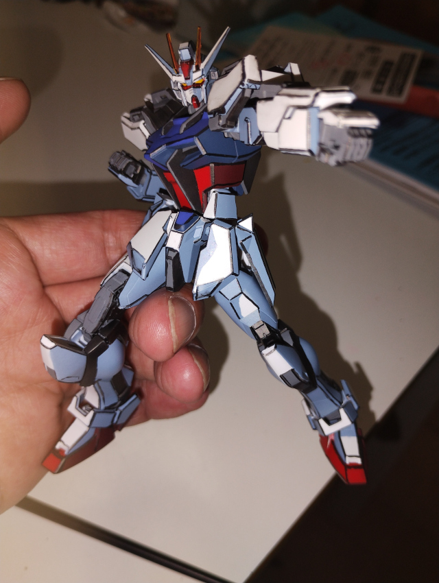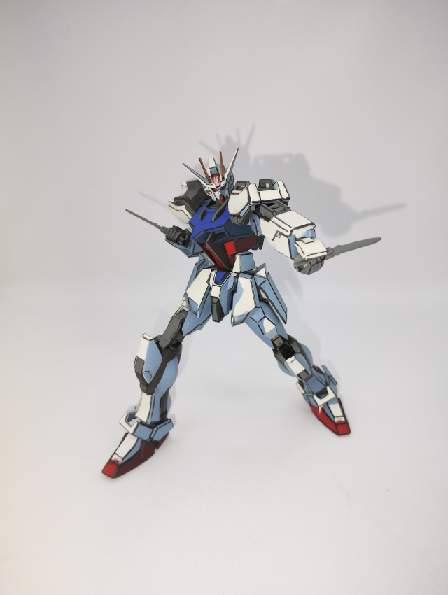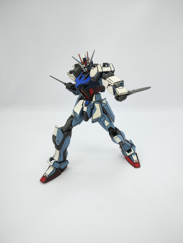 気分転換に、EGストライクガンダムをちまたで流行りのアニメ塗りで作りました。 アーマーシュナイダーがついていない方のEGストライクだったので、 塗装はラッカー系で基本色を塗ったあと、影色をマスキングしまくりでエアブラシ塗装。 何か所かマスクする所が逆になって色がテレコになってしまいました。 主線は水性マーカーで塗装。 フラッシュたいて写真撮ると、いい感じに見えるようになりました。 フラッシュたいて写真撮るまで、「失敗作ちゃうか?」と不安で不安で(笑) 「主線をキレイに塗る為にエッジの整理が必要だなー」とか、 マスキングめんどくさい派なので、またこの手法やるかわかりませんが。 店頭でご覧になられた方は、ぜひフラッシュをたいてスマホで撮影してみてください。  |